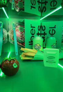 Through glass doors, attendees stepped into a room full of produce stands and shelves of fake wine bottles, sodas, chips and boxes. With the push of a button on a wall of canned goods, a green-gloved hand popped out from a trap door and gave out a Starry can, a bag of Cheetos and avocado keychains. Adding to the freebies collected in their green grocery basket, participants could pick up a cooling eye mask with gel beads from inside an ice chest.