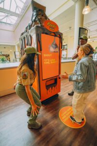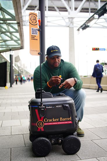 AI-powered food delivery robots cruised through tailgates, parks and hot spots around New Orleans, delivering Cracker Barrel Cheese’s sticks and bites to fans. Each Kiwibot was equipped with a QR code that they could scan to shop Cracker Barrel Cheese’s snacks, and the brand posted the locations of the robots on its Instagram page. Former NFL player and TV host Anthony “Spice” Adams spent some time with the delivery bot. (Agency: Konnect Agency, p.r.)