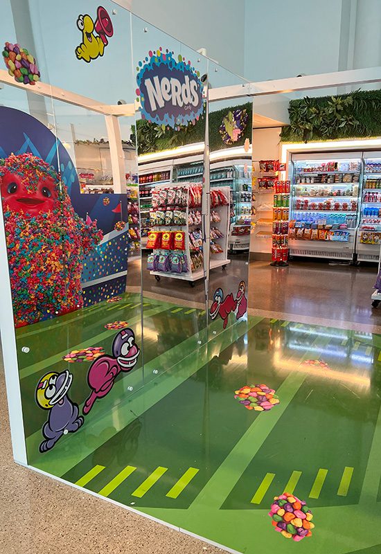At the airport’s New Stand shop, Nerds popped up a glass and mirrored box that featured a colorful cartoon stadium design and its Nerds characters, including the pink Nerds Gummy Clusters giant from last year’s debut Super Bowl commercial, which returned in a TV spot with country singer Shaboozey. Travelers could stand on the football field inside the box and snap a selfie in the branded mirror adorned with football helmet-wearing Nerds.