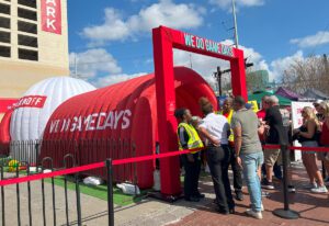 But attendees were most drawn to the power tool experiences. EGO’s “The Elements of Football” had fans use a stationary blower to launch a mini football through uprights, and over at Bosch’s “Digital Drill Challenge,” participants grabbed a drill and aimed it at a Lowe’s-branded arcade cabinet to digitally fasten screws and sockets on the screen. Finally, attendees exited through the “Lowe’s Home Team Toss,” where they did their best to throw a football through the “O” in a tall display of “HOME TEAM” free-standing letters.