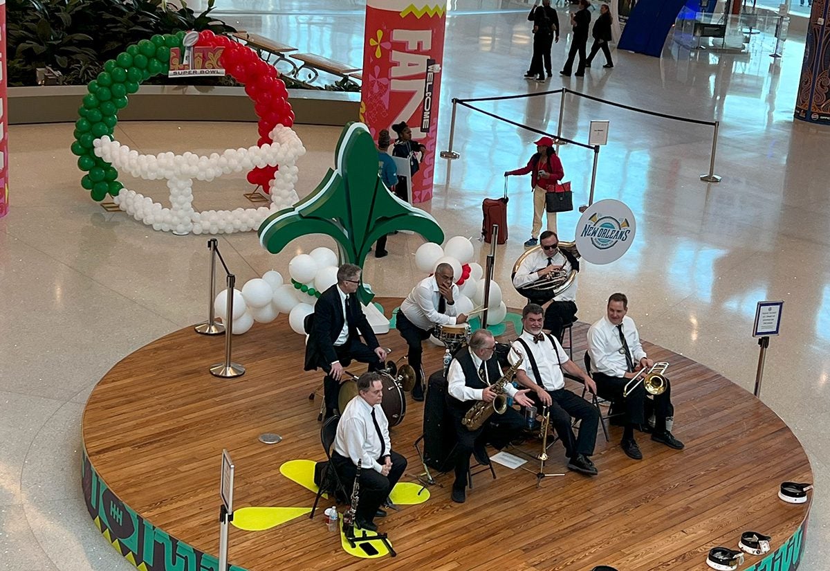 One extra standout feature to mention, compared to Super Bowl LVIII in Las Vegas last year, the city as a whole got more in on the Super Bowl celebration. When football fans arrived at Louis Armstrong New Orleans International Airport, they received a warm welcome. The airport was decked out in signage and décor touting the Big Game, from step-and-repeat banners to column wraps to large window clings to football helmet-shaped balloon arches. Licensed merchandise was front and center in every airport shop, and a stage with a fleur-de-lis sculpture and two oversized balloon bead dogs, each representing the Eagles and Chiefs, hosted performances by a local jazz band that passengers enjoyed as they collected their luggage.