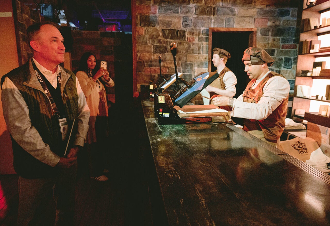“Our whole philosophy is that AI is not the thing that’s super; it’s you. It’s the person who is doing the work the whole time. So with the Epochs of Communication, we put people in those shoes,” says Dame. “It’s you making the cave painting. It’s you making the paper. It’s you seeing the press. It’s you typing the keys on the typewriter—all to reinforce this ‘it’s all you’ [messaging] and an ‘it’s just a tool to be used’ kind of mentality.”