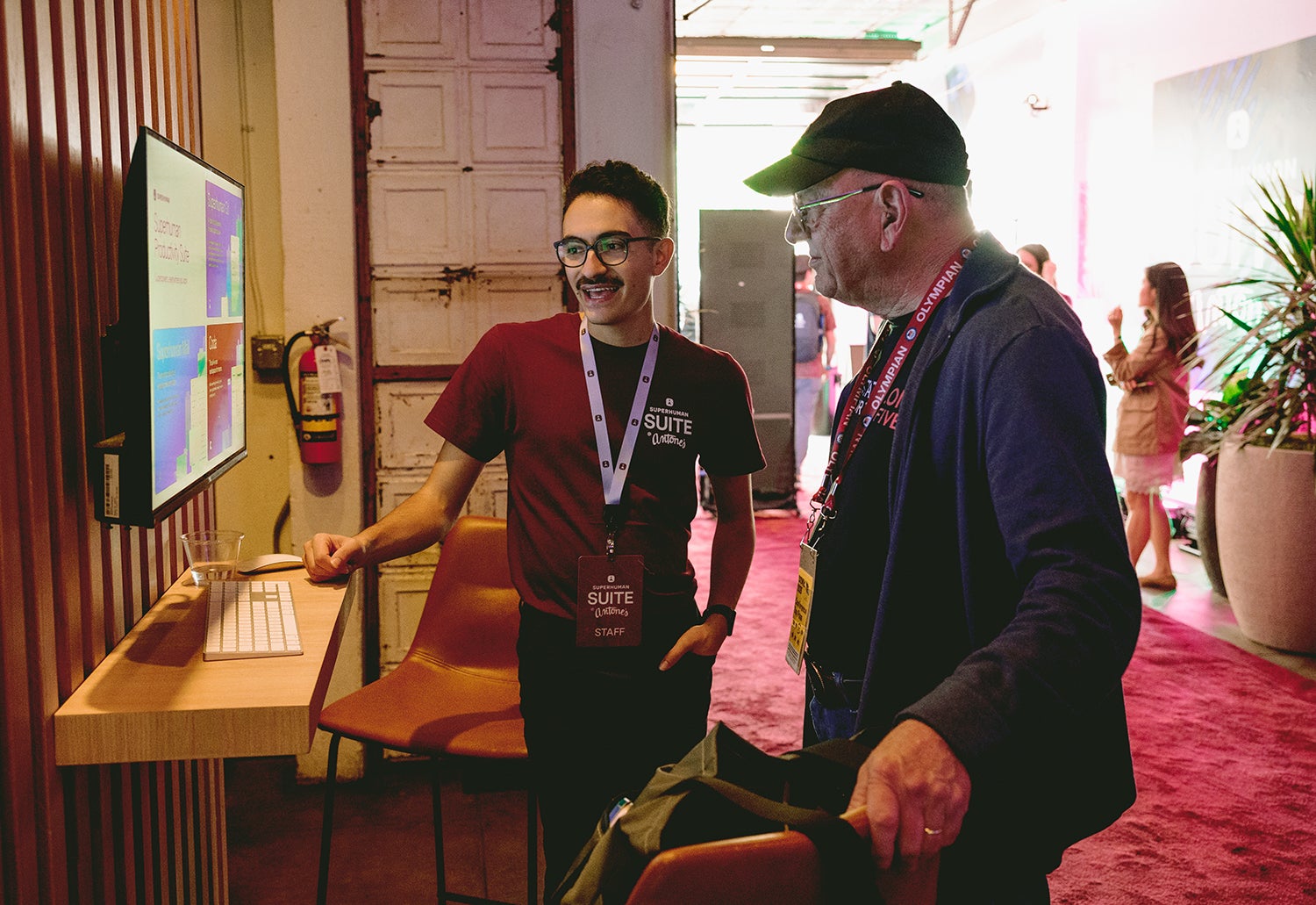 The guided demo stations scattered throughout the footprint were also a hit, and Superhuman was “pleasantly surprised” to find that attendees were interested in participating throughout the suite’s three-day run. “They came in very curious, and they would see the epochs, they would read the signage, get the messaging, and then be like, ‘Show this to me in action.’ It was a great takeaway for us,” Dame says.