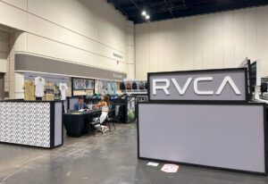 We turned down the first surf section aisle and noticed almost all of the booths in the area had half-height walls around the perimeter of their exhibits. Billabong’s pony walls sported a natural wood look with a logoed sign high above the booth’s opening. Inside, clothing racks lined the walls (not entirely visible to passersby unless they peeked over), and wooden planks attached to the top of the walls created extended backpack and apparel displays. Across the way, RVCA featured a similar wood-based build, but a completely different color scheme of gray, white and black gave it a more modern feel.