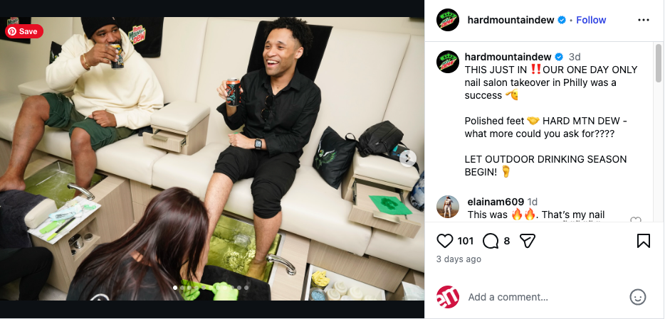 On April 9, consumers 21-plus who booked an appointment could stop by Luxe Nails for a branded spa experience that included a full complimentary pedicure and ice-cold Hard Dew to enjoy while getting pampered. Fun detail: lighting effects made the pedicure baths look like Dew’s signature green color.
