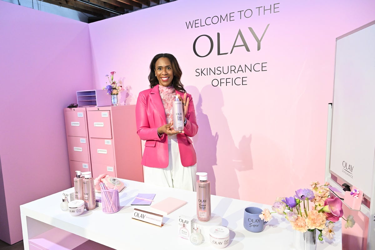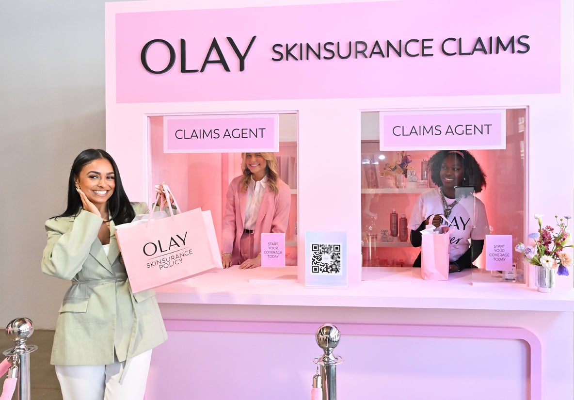 There were no coverage limits or deductibles, but there was a robust “5-in-1” coverage plan up for grabs on April 21 at the Olay Skinsurance Office in New York. The pink-drenched pop-up, which resembled a traditional insurance office, but with a pastel twist, was helmed by influencer Corporate Natalie (Natalie Marshall), the operation’s lead “Skinsurance Agent.”