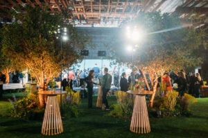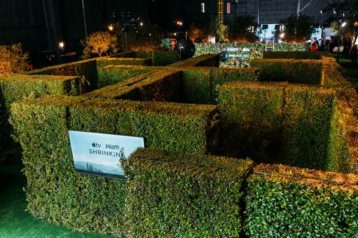 From there, they were led by a procession of red flags through a giant hedge-maze installation in a recreation of “Shrinking’s” opening sequence. Then it was straight into the event reception, where a SoCal park-themed environment awaited. Wooden benches and café tables, faux grass and 14-foot-tall oak trees with layers of locally sourced foliage all added to the ambience.