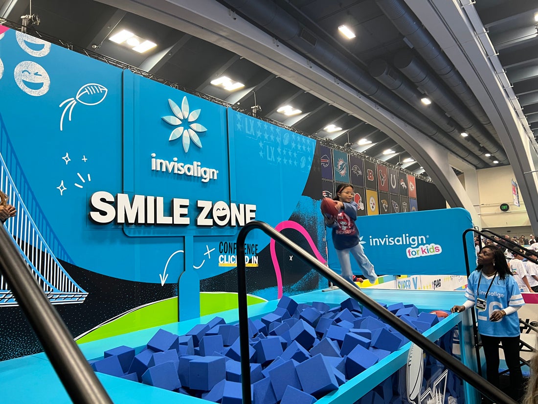 The Invisalign Smile Zone was packed when we showed up on the scene, as kids took over the adjacent Play Football Field, presented by Invisalign, for flag football skills drills. Inside the illuminated “confidence clicked in” booth, young fans lined up for their turn to jump into a blue foam pit photo op.