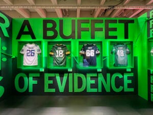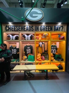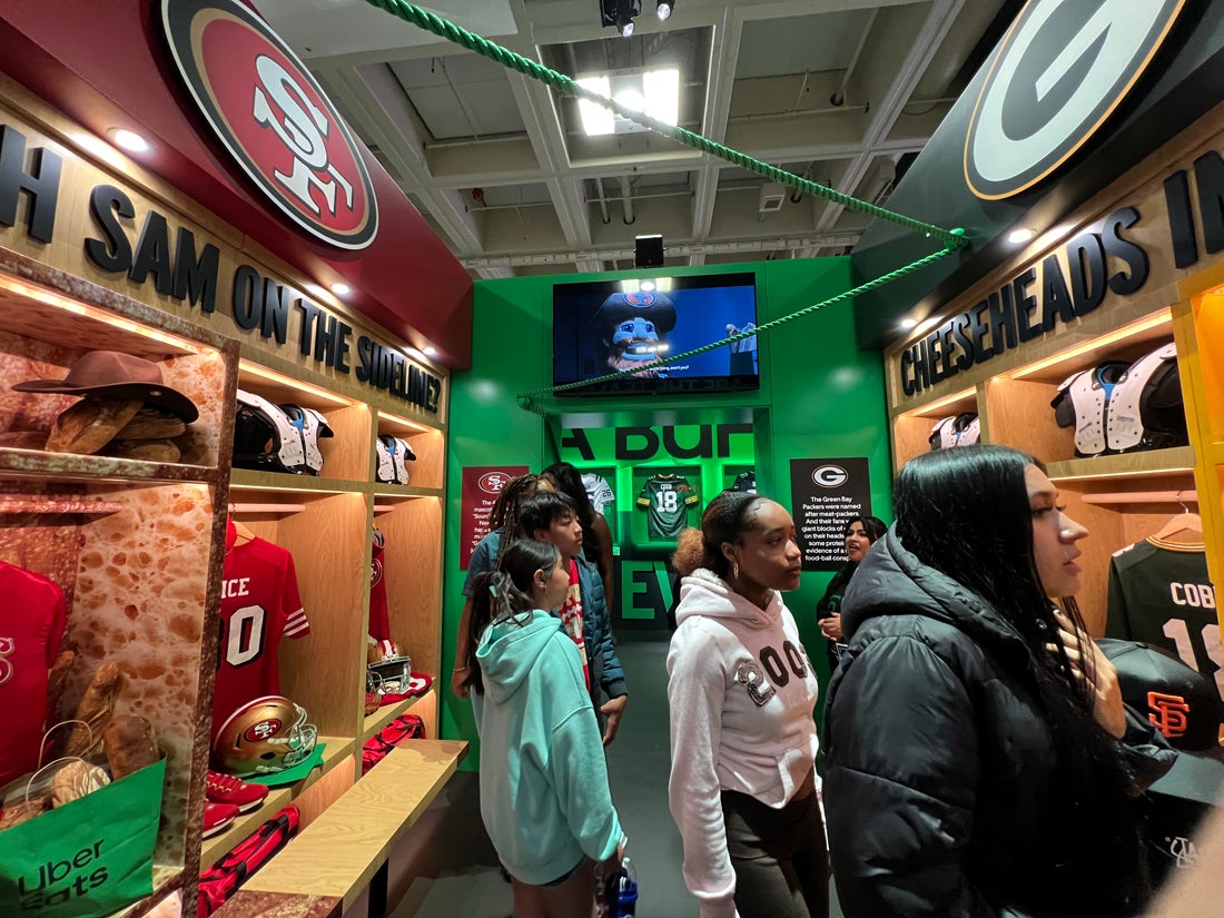 After a few minutes of investigating, a brand ambassador moved a bookcase, and we entered a secret room filled with “A Buffet of Evidence”—a display of NFL jerseys that had last names related to food: Ham, Rice, Bacon, Cobb, Bass, Cherry, and French and Fries placed side-by-side. The next area, themed like a locker room, asked us to think about how the San Francisco 49ers have its Sourdough Sam mascot on the sideline and how the Green Bay Packers’ fans are known as Cheeseheads, not to mention the team name’s meat-packer origins. Very interesting…
