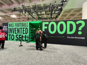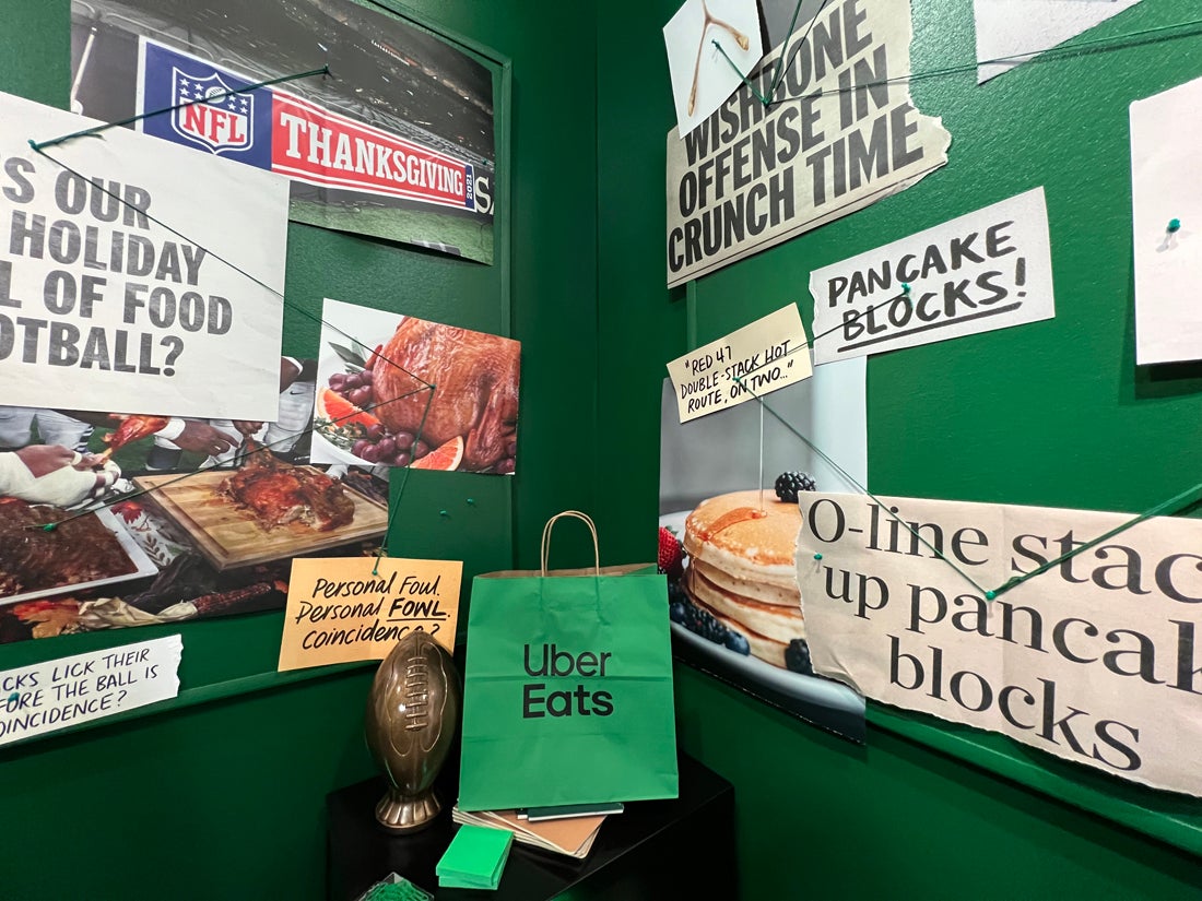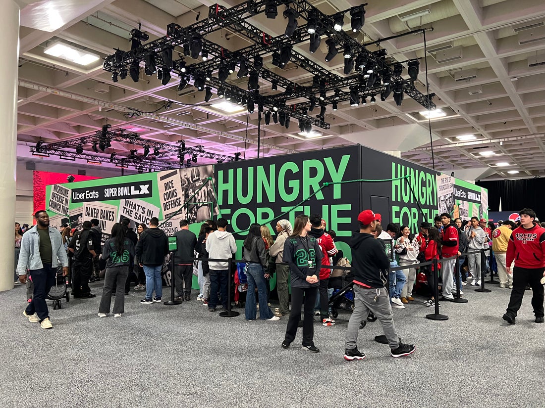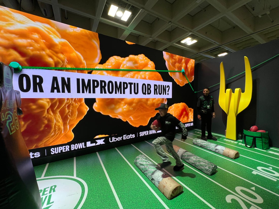 Was football invented to sell food? That was the question at the center of Uber Eats’ activation at Super Bowl LX Experience at Moscone Center in San Francisco. The brand asked football fans to get to the bottom of the conspiracy, inviting them into an enclosed footprint with exterior and interior walls covered in large-print messaging that added fuel to the fire, like “The field goal post was designed after a fork.”