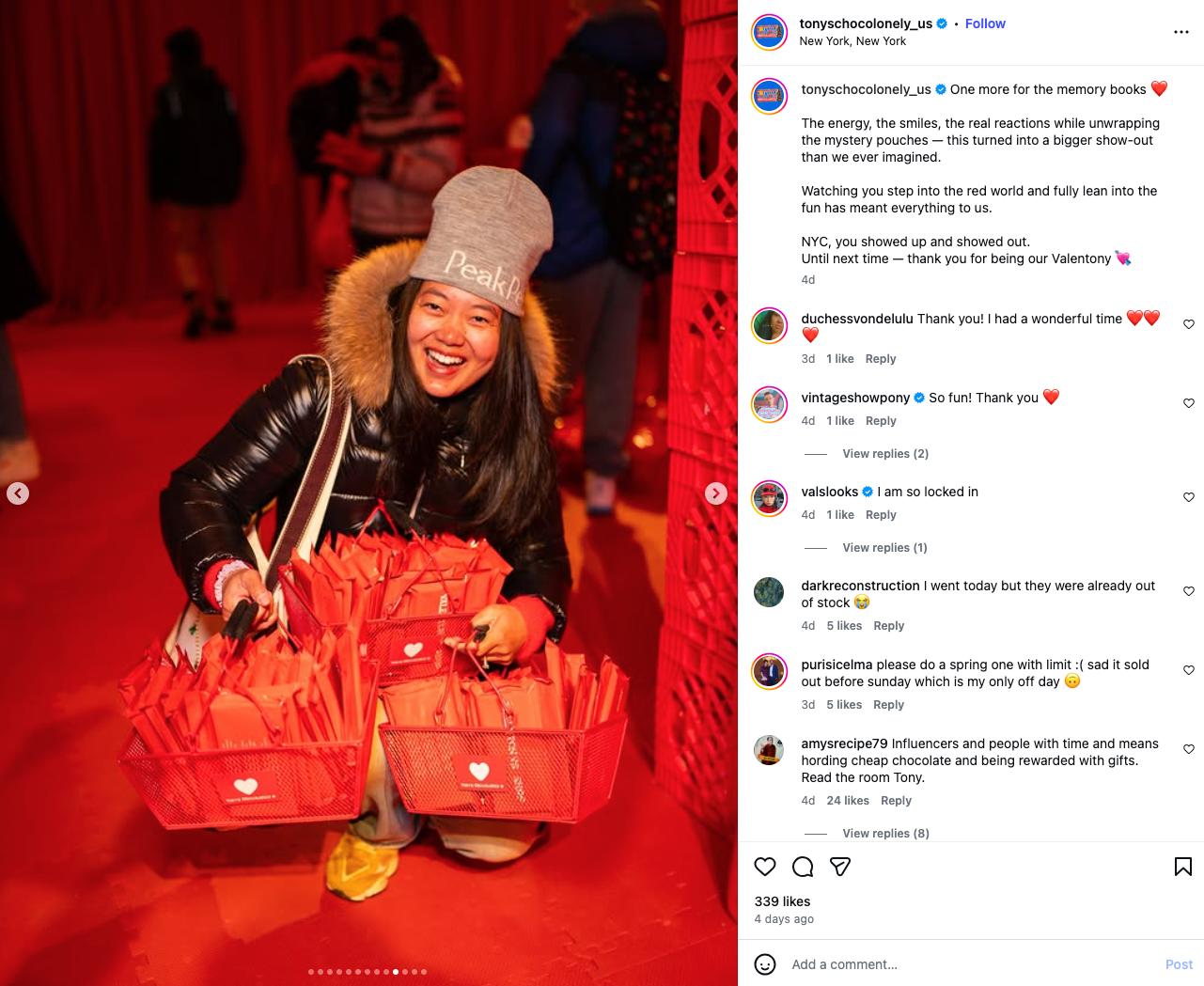 From Feb. 6-8, Tony’s Chocolonely made a statement about inequality in the cocoa industry while marking Valentine’s Day with “Valentony’s Shop,” powered by Spotify, a pop-up in NYC that was dripping in the brand’s rich red hue. Designed in partnership with artist Cj Hendry, the space centered around a monochromatic installation of blind boxes.