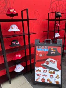 For the men’s championship, Wendy’s occupied one of the largest footprints among a dozen brands on-site with “The Square” activation, a 20-square-foot LED cube structure (a play on Sphere Las Vegas, but square like Wendy’s burger patties, of course) that displayed dynamic graphics. There was also a Wendy’s roadside sign, larger-than-life french fries’ box and massive signage featuring the Wendy’s logo with the Wendy persona front and center. The brand served up free Dave’s Single hamburgers, fries and Orange Dreamsicle Frosty treats. Fans could also score a bucket hat that they could customize with Wendy’s- and NCAA-branded patches.