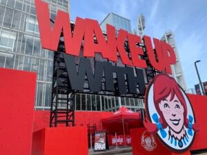 For the women’s championship in Cleveland, the brand posted up outside the stadium in the mornings to serve free breakfast sandwiches, offer up more customizable bucket hats and serve as a photo op for fans with its supersized signage, including “Wake Up With” messaging, the Wendy persona and the signature red color everywhere fans turned. The activation mapped back to the brand’s objective to change mindsets and remind consumers that Wendy’s has a breakfast menu.